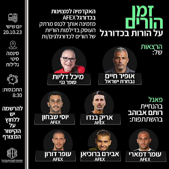 מעבר לפעילויות במסגרת בתי הספר, Afex גם מפיקה כנסים וימי עיון מקצועיים במגוון תחומים הקשורים לספורט – החל מפיזיולוגיה ותזונה ועד לחדשנות טכנולוגית וניהול ספורט. אירועים אלו מהווים פלטפורמה לשיתוף ידע, ליצירת קשרים ולקידום שיח מקצועי בקרב אנשי המקצוע המובילים בתחום.